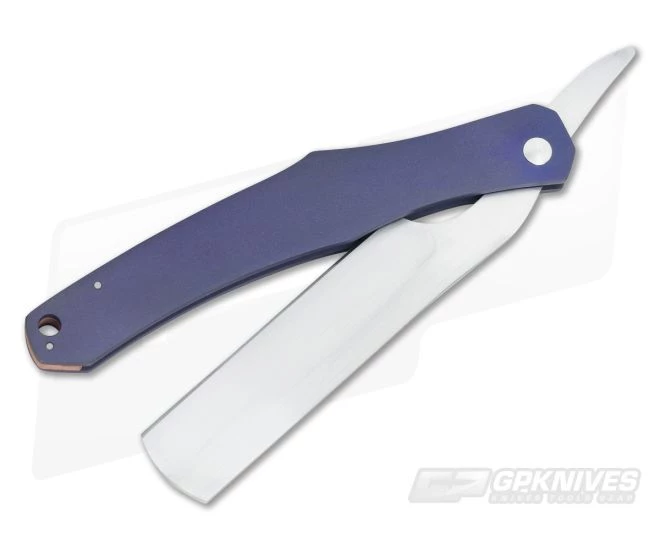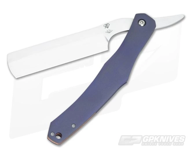 The Handle: Aaron chose titanium construction for the handle, bead-blasted it then anodized it a dark blue. He kept some very nice handle ergonomics of bends and contours found on many traditional straight razors. Torx hardware with a copper backspacer round out construction on this classic revival.