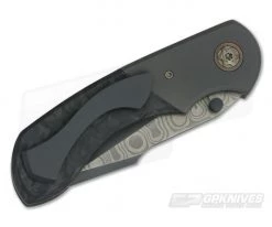 The Handle: Robust, bronze anodized titanium liners are blasted for a matte finish and support dark blasted titanium bolsters that are dove tailed to sleek, marbled carbon fiber handle scales. The secure liner lock mechanism is flawlessly executed for smooth, reliable operation. Custom TiConnector hardware in darkened titanium completes the construction with a bronze anodized custom pivot rounding out the stealthy look. Texturing on the lock bar cutouts adds a subtle custom touch.