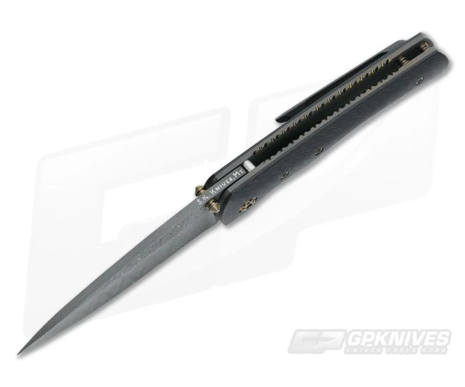 The Gulo folder from custom maker Steven Kelly out of Bigfork, Montana is for those who like to carry in style. The model is a tactical design with gentleman’s outter wear. It is suited with lightweight Carbon Fiber and Chad Nichols stainless damascus.