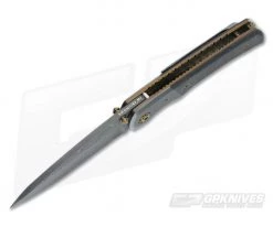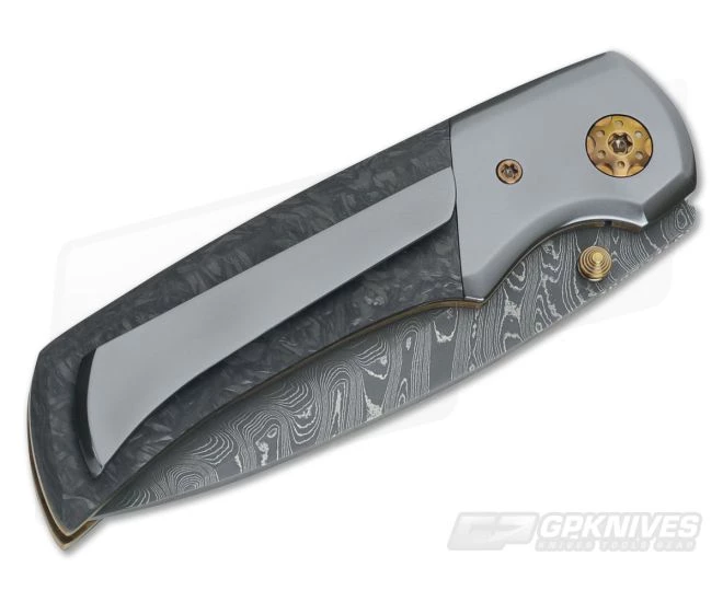 The Blade: Built from gorgeous swirling Nichols damascus, this spear point was hollow ground by Steve and accented with his Bronze Ti dual thumb stud openers. Action on the blade is smooth and consistent riding along a phosphor bronze pivot. It offers the user just over three inches to work with and looks great. This one is well centered in the closed position.
