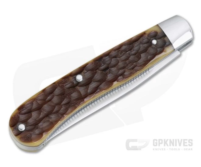 Handle: Clean and stylish, the Bourbon Jigged Bone covers are fit to satin finished, stainless steel bolsters which are precision fit to the stainless steel liners. Offering a handsome and rugged appearance, the bone covers are comfortable in the hand and the pocket. Delivering a truly custom feel is the subtle detail of file work on the inside of the back spring and coin edged liners. Stainless pins are used to secure the covers and the display side has a stainless shield for a timeless feel. The back spring is smooth and solid with half-stop action and sits flush in all three positions.