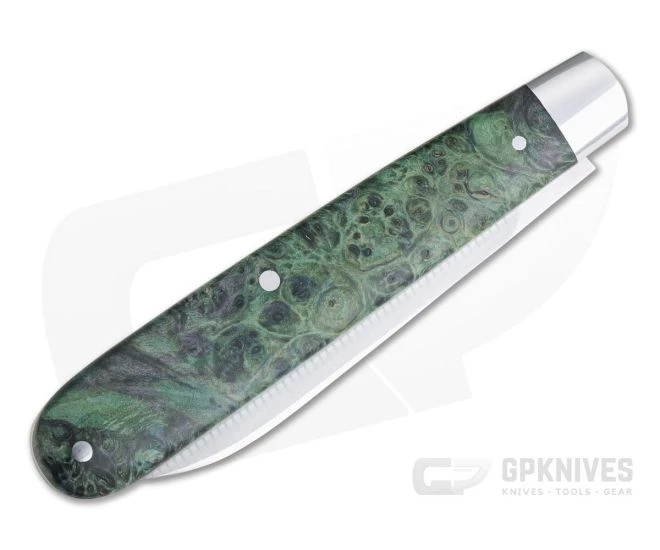 Todd Davison provides custom, traditional slipjoint pocket knives that are truly handmade and one of a kind. Having produced over 1600 slip joint knives, Davison utilizes premium materials and offers exceptional quality and attention to detail in a timeless, traditional design. This version comes with hand rubbed satin, CPM 154 drop point blade, liners and bolsters with Green Box Elder Burl wood covers.