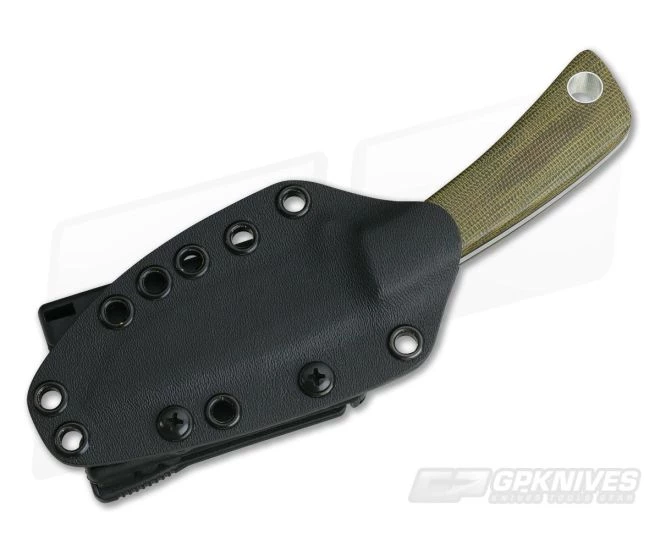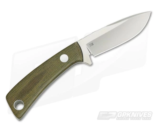 Handle: Green Canvas Micarta handle scales are smooth and contoured for comfort on the ergonomically designed handle. Black liners add a subtle visual element between the satin tang and green Micarta. The curving, neutral handle design locks the hand in without compromising versatility for multiple grips. The scales are attached via a single pin and oversize hollow lanyard tube.