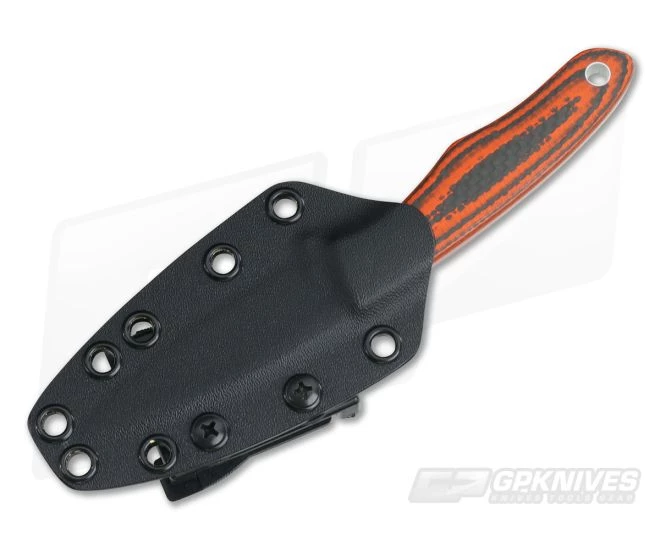 The Ultimate Caper custom fixed knife from maker Tom Krein is a compact masterpiece for hunting or every day carry. The sub-3 inch CTS-XHP blade offers nimble yet powerful cutting performance with its shallow hollow grind while Tom’s Orange and Black Carbon Fiber handle is designed and finished to provide optimal comfort and control.