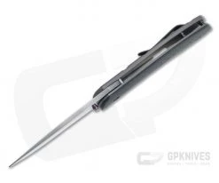 Handle: Handle construction is simple and robust with a thick slab of blasted titanium forming the frame lock side and a thinner titanium liner supporting the blasted and contoured Carbon Fiber handle scale that offers a solid and comfortable grip. The open back construction is completed with custom anodized titanium barrel spacers from Steve Kelly.