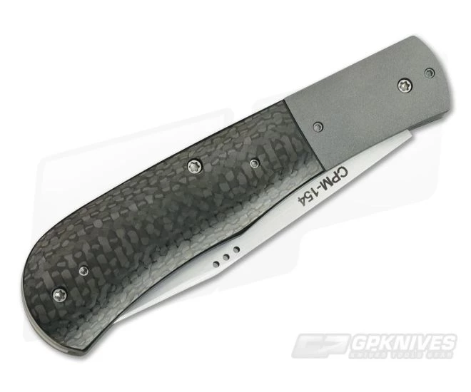 Handle: Offering a blend of modern and traditional design the handle is comprised of a steel back spring, blasted titanium liners and polished carbon fiber handle scales dovetailed to blasted titanium bolsters. The handles are held together with titanium Torx hardware. The large, classic handle profile is comfortable during periods of extended use while maintaining a slim, easy to carry profile.
