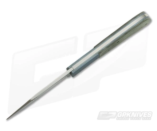 Handle: Offering a blend of modern and traditional design the handle is comprised of a steel back spring, blasted, blue anodized titanium liners and Green Canvas Micarta handle scales dovetailed to blasted, blue anodized titanium bolsters. The handles are held together with titanium Torx hardware. The large, classic handle profile is comfortable during periods of extended use while maintaining a slim, easy to carry profile.