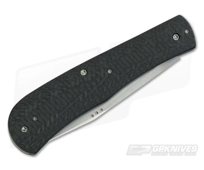 Handle: Offering a blend of modern and traditional design the handle is comprised of a steel back spring, blasted titanium liners and matte finished carbon fiber handle scales all held together with titanium Torx hardware. The slip joint operation has a solid half stop operation for safety. The large, classic handle profile is comfortable during periods of extended use while maintaining a slim, easy to carry profile.