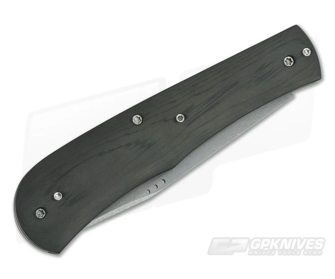 Handle: Offering a blend of modern and traditional design the handle is comprised of a steel back spring, blasted titanium liners and uni-directional carbon fiber handle scales all held together with titanium Torx hardware. Uni-directional carbon fiber has a wood grain look that lends itself to this design. The slip joint operation has a solid half stop operation for safety. The large, classic handle profile is comfortable during periods of extended use while maintaining a slim, easy to carry profile.
